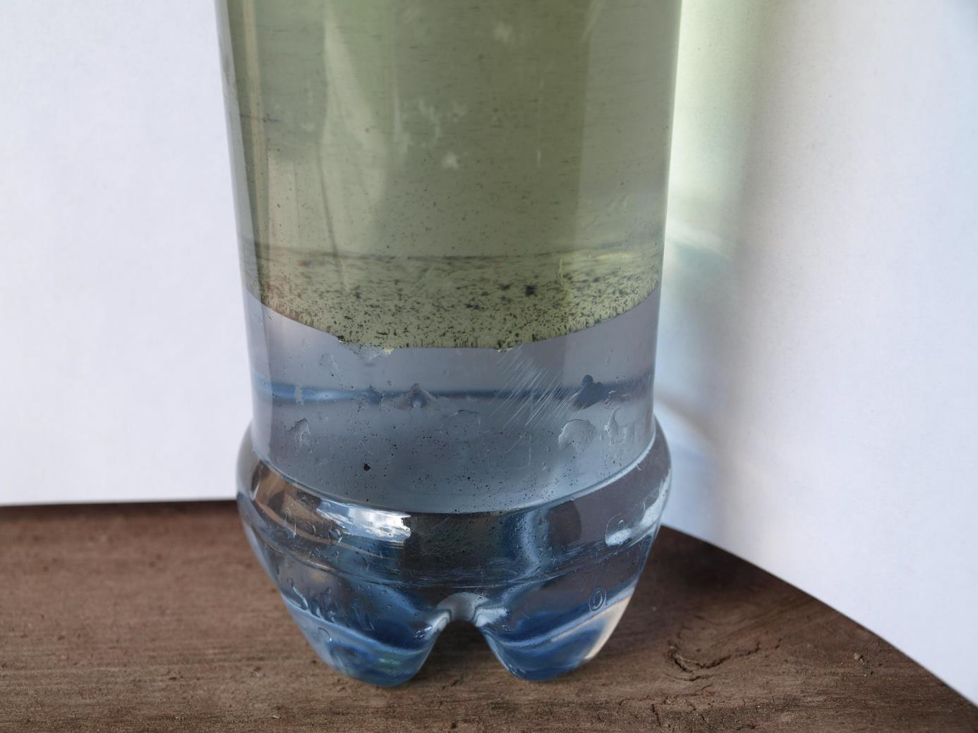 Bilden på plastflaskan är ett exempel på kondensat från en oljedepå efter kondensorn i ett kolfilter, notera de olika faserna. Oljan flyter ovan vattenfasen som är under.