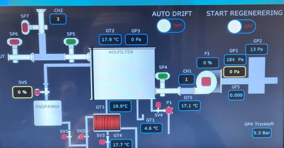 Principen är att kolfiltret hettas upp med ånga och därmed drivs VOC av från kolets yta och följer med ångan ut ur filtret till en kondensor. I denna så kondenseras ånga och VOC och man erhåller 2 skilda vätskefaser under förutsättningar att VOC är icke polär ( ej vattenlöslig). VOC avskiljs och kan eventuellt återanvändas i någon form eller brännas i en panna.