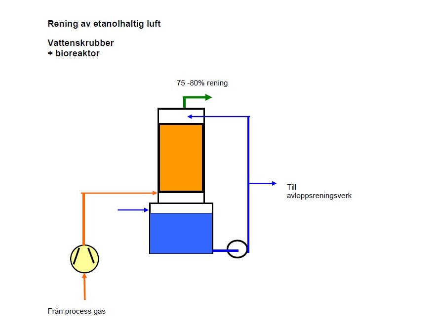 Skrubber kan vara ett komplement eller en ensamstående reningsutrustning. Principen är att man använder vatten som skrubbermedia. De gasformiga föroreningarna avskiljs under förutsättning att de har en viss polaritet dvs löslighet i vatten. De lösta föroreningarna kan därefter brytas ned i en bioreaktor med hjälp av mikroorganismer. Vattnet kan sedan återanvändas i skrubbern. Ett annat alternativ är att vattnet skickas till det kommunala avloppsreningsverket och kan i dessa brytas ned i luftningsbassängen. Detta förutsätter då att VOC kan utgöras som en kolkälla i reningsverket. I allmänhet är det brist på kolkällor i avloppsreningsverk och man får tillsätta dessa externt.